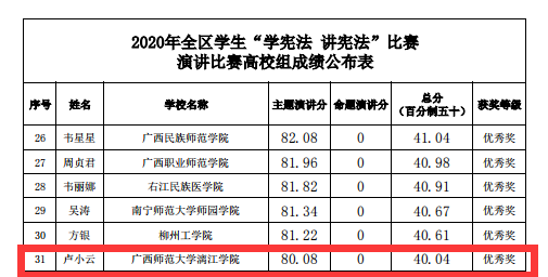 全区学生“学宪法、讲宪法”比赛暨第五届全国学生“学宪法、讲宪法”广西赛区决赛于10月24-25日在广西艺术学院南湖校区举行。本次大赛由广西壮族自治区教育厅主办,由知识竞赛和演讲比赛两个部分组成。