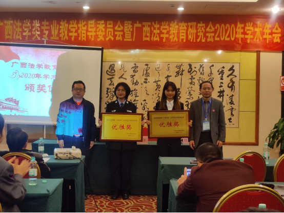 28日上午,教师及学生代表参加了广西法学类教学指导委员会暨广西法学教育研究会2020年学术年会颁奖典礼。我校商贸与法律学院2018级法学专业代表队获得了广西高校第四届“八桂法声”法学专业大学生辩论赛优胜奖;2018级法学专业学生黄昊、卢小云均获得第一届“八桂法声”法学专业大学生演讲比赛三等奖。
