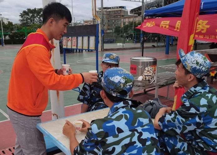 军训期间天气反复无常,训练场上常有冷风呼啸。为了给同学们补充能量、预防感冒发烧,保证军训的正常进行,党员服务站还为同学们准备了温暖的姜茶,从运送姜茶到号召同学共享温暖,志愿者们的亲力亲为,无疑是在这寒冷秋风中为心灵端上的一杯“姜茶”。在训练场,随处可以看到志愿者们忙碌的身影:在服务站为同学答疑解惑,到训练场上给教官定时送水,为训练时身体不适的同学提供帮助。
