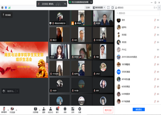 根据校党委的工作安排,商贸与法律学院学生党支部于3月13日晚开展线上组织生活会,查摆自身问题,剖析思想根源,开展批评与自我批评,并开展民主评议。商贸与法律学院党总支书记陈俊杰、商贸与法律学院党总支副书记刘雪以及商贸与法律学院学生党支部全体正式党员、预备党员参加了本次会议。会议由学生党支部副书记谭海练主持。