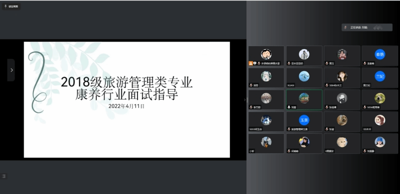 为进一步帮助2022届毕业生顺利就业,提升毕业生精准化面试能力,4月11日晚,酒店与旅游管理教研室刘莹莹老师于腾讯会议平台为同学们开展了康养行业精准化面试指导。