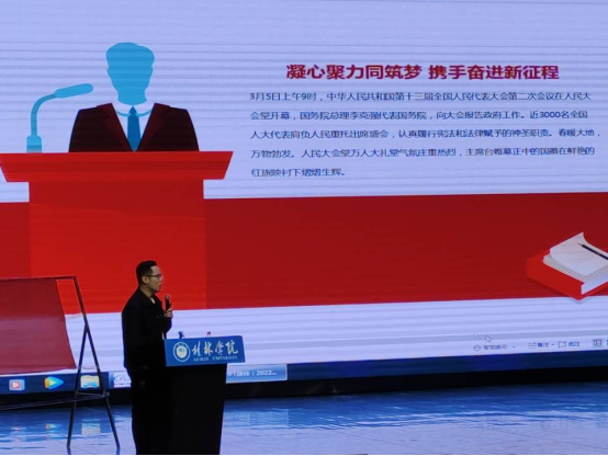 齐唱结束后,宋丹阳老师围绕“聚焦两会,关注两会”主题,从全国人大十三届五次会议基本概况、2021年政府工作回顾、2022年经济社会发展总体要求和政策取向、2022年政府工作任务和2022年对政府工作的要求五个方面展开论述,带领同学们认识两会,鼓舞同学们关注两会,聚焦时政,学习理解两会精神。并提到:“在过去的一年里,我国的经济保持恢复发展,改革开放不断深化,生态文明持续推进,人民生活水平稳步提高,疫情防控成果持续巩固;展望未来,2022年,我国也制定了种种目标,要在工作中稳中求进,稳定市场就业,深入实施创新驱动发展战略,扩大内需,促进乡村全面振兴,扩大高水平对外开放,改善民生,要加强反腐败,发挥政府职能。”听完宋丹阳老师的演讲,同学们都有许多的收获,作为当代大学生,祖国未来之栋梁,应关注两会,了解我国未来的机遇与变革,才能在未来对祖国的建设中表现得更强大、更有力。