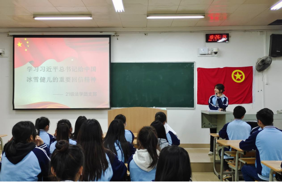 为贯彻习近平总书记给中国冰雪健儿的重要回信精神,感悟习近平总书记的勉励与殷殷嘱托,4月17日晚,商贸与法律学院组织各团支部开展学习重要回信精神的主题班会。