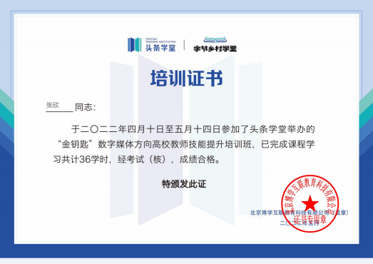 自媒体运营职业技能培训以抖音运营为中心,从短视频、直播电商行业现状及趋势,有变现潜力的抖音账号的搭建,有变现潜力的短视频制作以及院校如何做抖音四个方面进行了详细的讲解和操作指导。参加培训的五位专任教师经过四周的线上学习、两周的抖音实操,最后参加并通过了结业考试,顺利取得培训证书。
