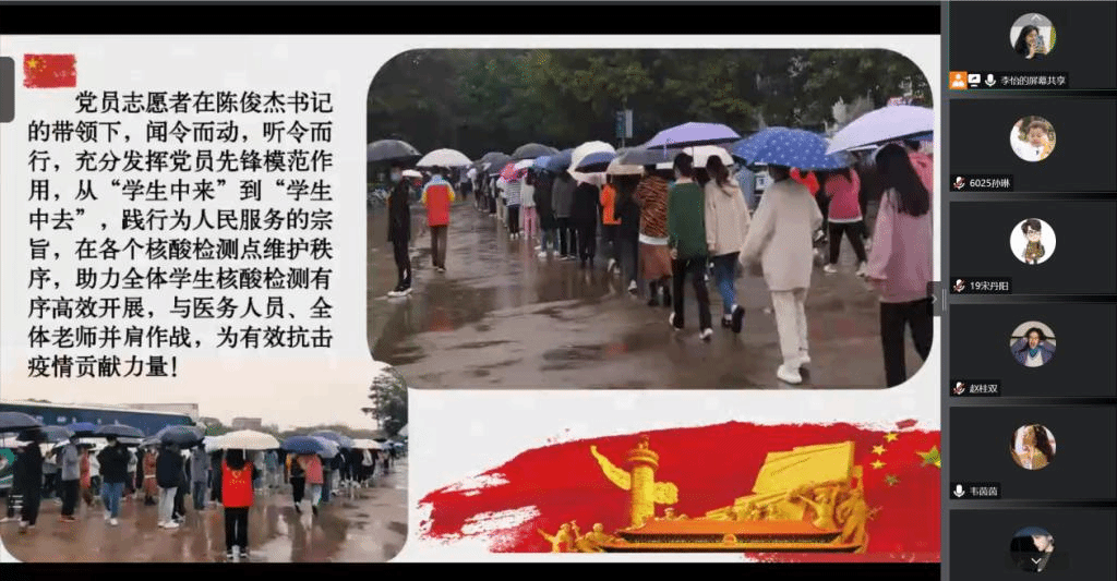 会议伊始,主持人李怡同志为大家解读《基层党建“五基三化”攻坚年行动方案》文件,解释了“五基三化”基本内涵和“六个保障”基本要求,并展示了我支部党员在学校疫情管理下充分发挥党员先锋作用助力疫情防控工作的优秀精神风貌。