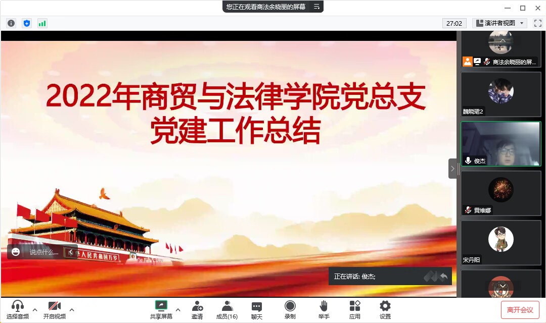 为深入学习贯彻落实习近平新时代中国特色社会主义思想和党的二十大精神,进一步落实全面从严治党要求,12月23日下午,商贸与法律学院党总支通过腾讯会议召开2022年党支部考核大会,全体党总支委员、部分教师党员及学生党员代表参加了会议,会议由党总支宣传委员余晓丽主持。