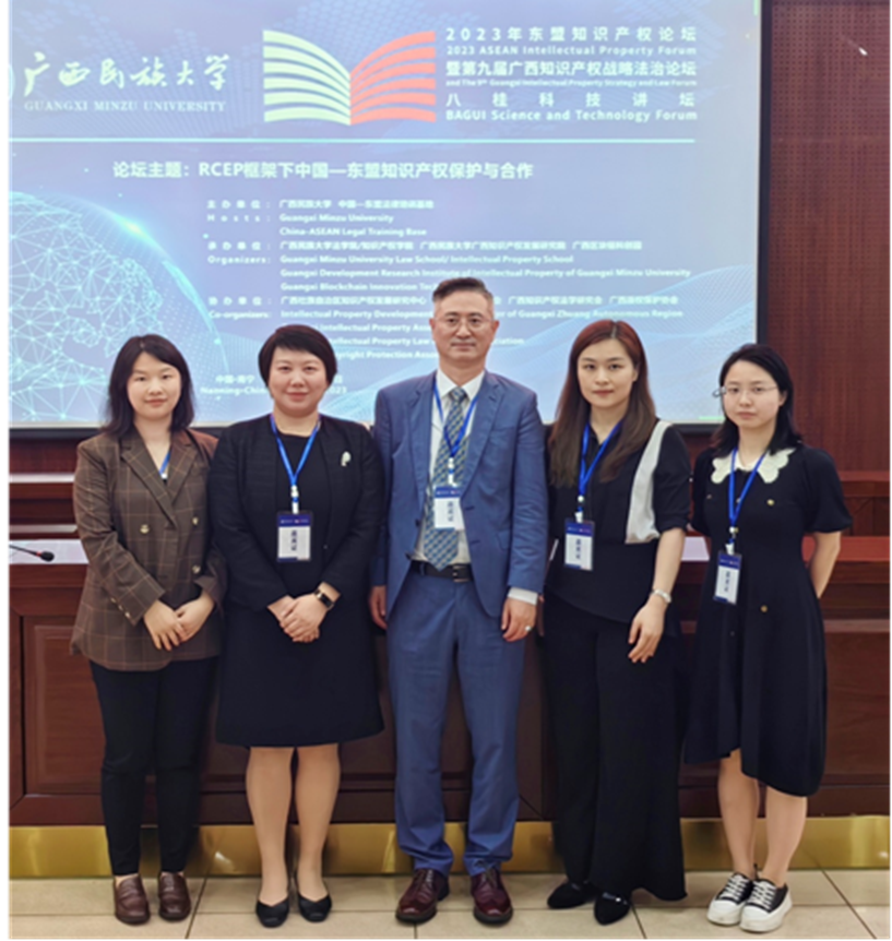 2023年4月15日,杨庆庆副校长率金融与法律学院相关人员一行4人,应邀参加“2023年东盟知识产权论坛暨第九届广西知识产权战略法治论坛、八桂科技讲坛”,该论坛由广西民族大学、中国—东盟法律培训基地主办,广西民族大学法学院/知识产权学院、广西民族大学广西知识产权发展研究院、广西区块链科创园承办,广西壮族自治区知识产权发展研究中心、广西知识产权学会、广西知识产权法学研究会、广西版权保护协会共同协办。广西民族大学校长谢尚果教授,广西壮族自治区法学会党组书记、常务副会长、自治区党委政法委委员黄光华,广西壮族自治区市场监督管理局党组成员、副局长、广西知识产权局局长徐文伟,广西壮族自治区科学技术协会党组成员、副主席朱其东等领导出席论坛开幕式并为论坛致辞,广西民族大学法学院/知识产权学院院长蒋慧教授主持开幕式。