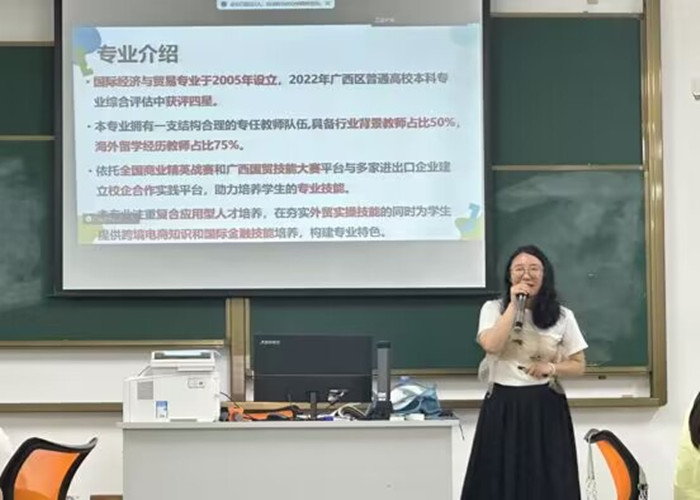 为引导新生深入了解所学专业、指导学生对专业知识的学习,9月27日下午,国际经济与贸易教研室召开了2023级新生“专业导航”主题讲座。本次讲座由教研室主任刘雨婷和专任教师蒋旭明主讲,2023级国贸专业全体新生及其辅导员谭海练参加了本次讲座。