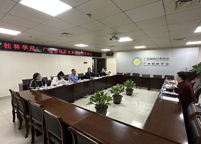 徐海首先热烈欢迎金融与法律学院一行的到访,并详细介绍了广西保险行业协会的基本情况和主要职能,特别强调了近几年在理论研究和行业培训方面的进展。林弛对广西保险协会对桂林学院金融与法律学院长期以来各个方面的支持表示衷心感谢,并双方在广西保险行业协会蓬勃发展背景下,加强合作,发挥各自优势,形成合力。胡乐天介绍了学院近年来取得的成绩,包括师资队伍建设、学生培养和校企合作等方面的发展情况。