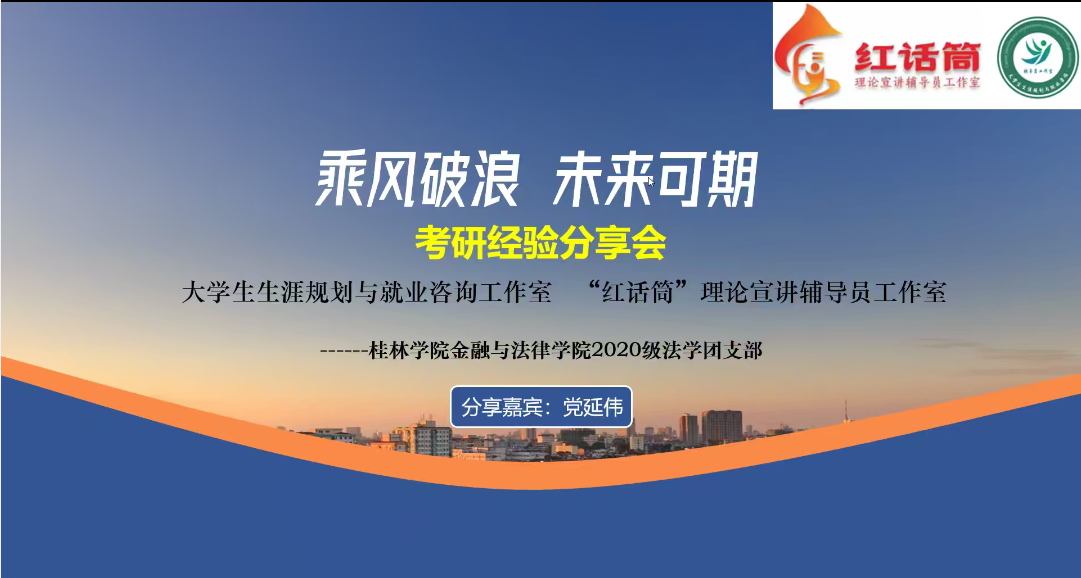 为进一步提高同学们考研复习效率,提高金融与法律学院考研的通过率,金融与法律学院杉湖家苑“一站式”学生社区党支部书记、团总支副书记、2020级法学专业辅导员党延伟老师,原广西师范大学法学院2016届法学专业硕士研究生、金融与法律学院学生社区党支部副书记、2023级金融学类专业辅导员赵曦老师,于10月22日晚面向2020级法学专业学生召开线上考研经验分享会。
