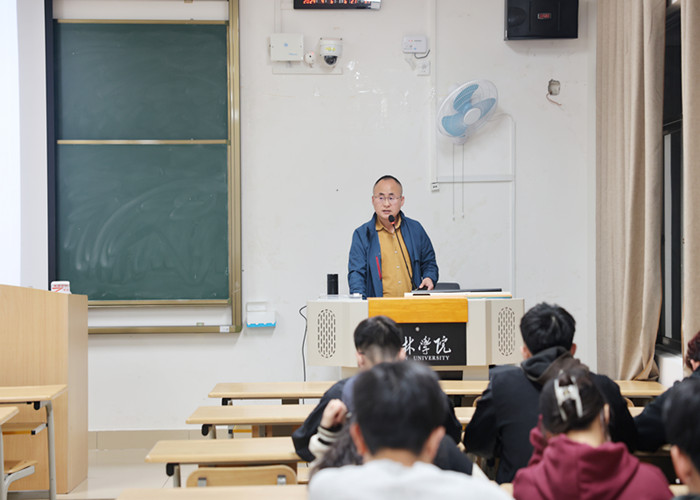 讲座伊始,党延伟带领全体同学集体学习习近平总书记在广西考察时的重要讲话。习近平总书记指出,广西要把铸牢中华民族共同体意识作为自治区各项工作的主线,作为推进民族团结进步创建工作的根本方向,巩固发展各族人民团结奋斗的良好局面。随后,党延伟抛砖引玉,回忆自己在学校工作期间,前往资源县咸水口开展精准扶贫工作的往事,分享个人工作经历,引出铸牢中华民族共同体意识的重要意义。党延伟从铸牢中华民族共同体意识的时代意义、关键所在及争做新时代有为好青年三个方面,结合中国发展史,深入浅出讲解中华民族共同体概念的提出与发展、铸牢中华民族共同体意识的重大意义,深刻阐述增强“五个认同”的重要意义,鼓励全体学生要为广西铸牢中华民族共同体意识示范区贡献桂院青年力量。