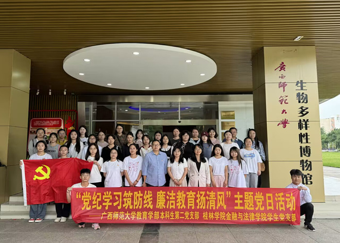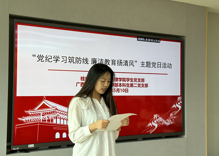 为深入学习贯彻党的二十大精神,强化党员干部的廉洁自律意识,营造风清气正的党内政治生态,5月10日,金融与法律学院学生党支部联合广西师范大学教育学部本科生第二党支部开展“党纪学习筑防线 廉洁教育扬清风”5月主题党日活动。