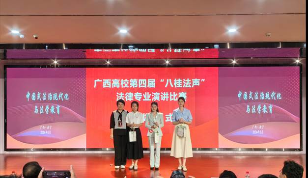 5月18日下午,广西高校第七届“八桂法声”法学专业辩论赛、第四届 “八桂法声”法学专业演讲比赛、第三届 “八桂法声”法律文书写作技能比赛也同时举办。本次三项竞赛共有11个广西高校派出代表队参与。竞赛以“以赛促学,以赛促教”为宗旨,旨在考验参赛学生的法律专业知识储备、语言表达能力、临场应变能力等多方面能力素养,是对法学学生培养质量的考核。通过积极备赛、参赛,我校参赛学生在专业知识和应用技能上获得了较大提升,本次参赛也为我校法学专业进一步深化应用型法律人才培养机制指明了方向。最后,在三项竞赛颁奖仪式上,我校副校长杨庆庆受邀作为颁奖嘉宾为演讲比赛获奖选手进行了颁奖。