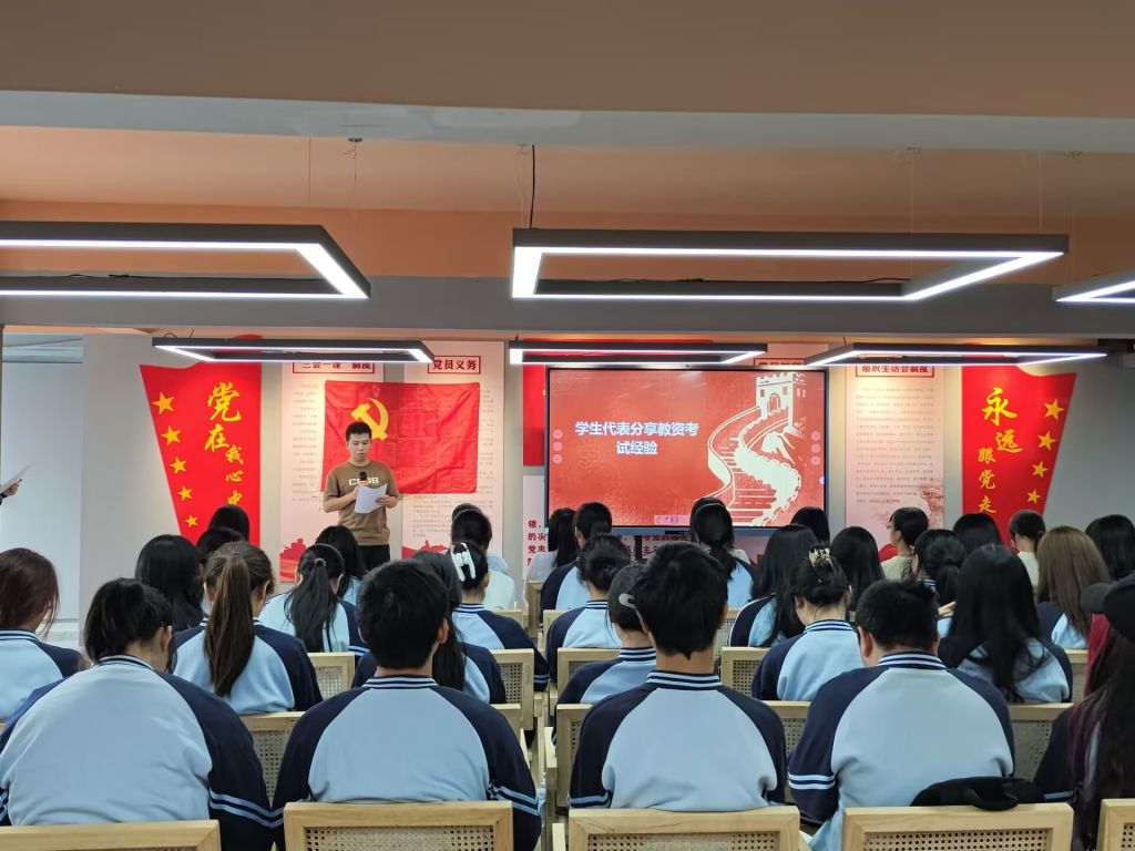 考虑到许多学生党员即将面临教师资格证考试等重要挑战,党支部还特别邀请了经验丰富的潘震同学为现场同学分享备考教师资格证的经验和技巧。潘震结合自己的亲身备考经历,从备考策略、应试技巧、心态调整等多个方面进行了全面而细致的讲解,鼓励大家保持积极的心态和坚定的信念,勇敢迎接挑战。潘震的建议和经验让学生党员们受益匪浅,激发了大家积极应对挑战、勇于追求梦想的决心。