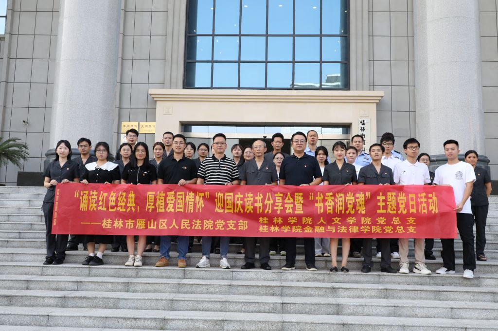 为激发党员的爱国情怀,共同庆祝祖国母亲的华诞,9月26日下午,金融与法律学院、人文学院与桂林市雁山区人民法院联合开展的“诵读红色经典·厚植爱国情怀”迎国庆读书分享会暨“书香润党魂”主题党日活动在雁山区人民法院党员活动室举行。雁山区人民法院党组书记、副院长、代院长苏革,党组成员、政治部主任、党支部书记廖婷,金融与法律学院党总支书记,人文学院党总支书记,雁山区人民法院党员代表、两个学院师生党员代表参加此次活动。活动由雁山区人民法院党支部副书记肖雄主持。