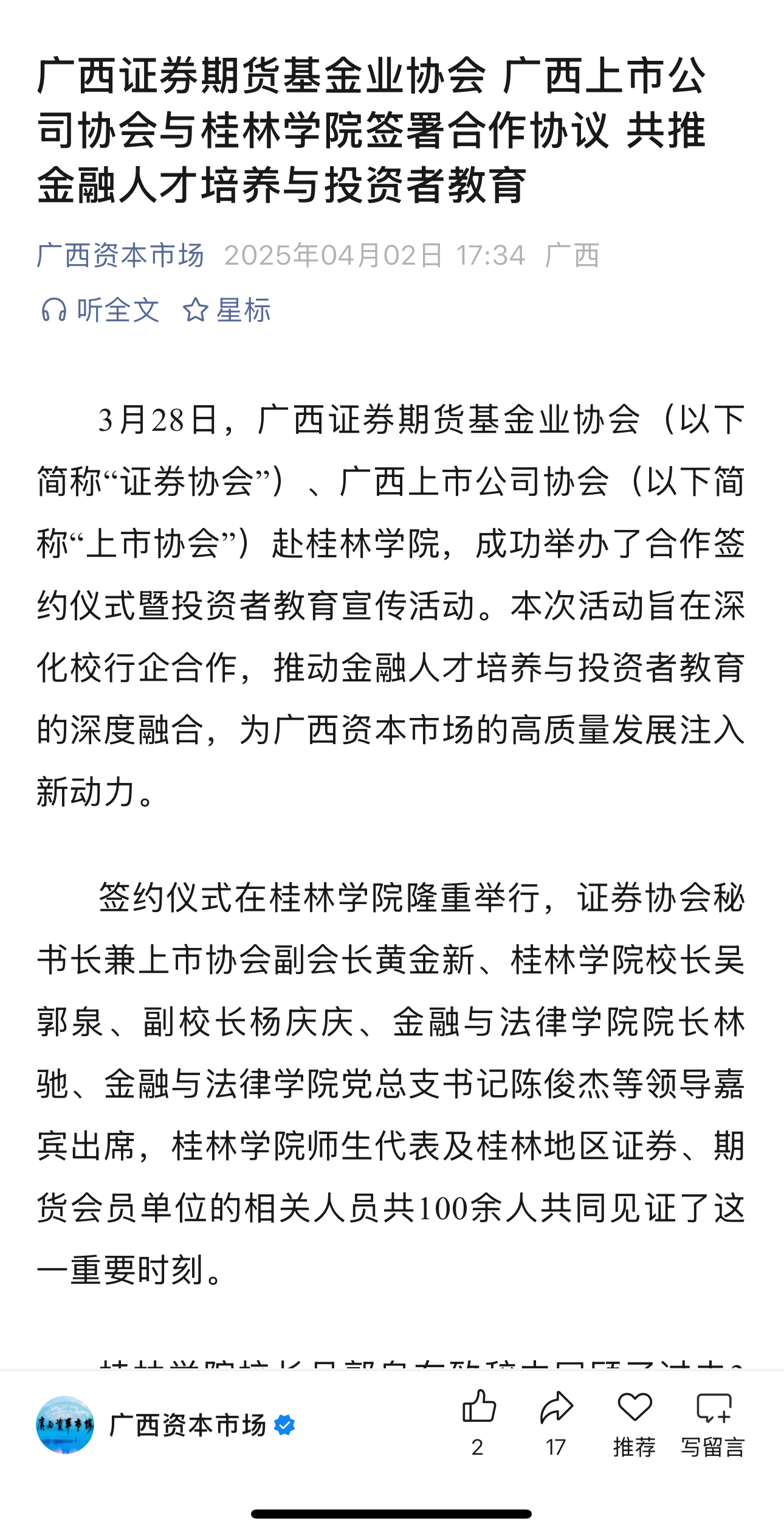 广西资本市场:《广西证券期货基金业协会 广西上市公司协会与桂林学院签署合作协议 共推金融人才培养与投资者教育》