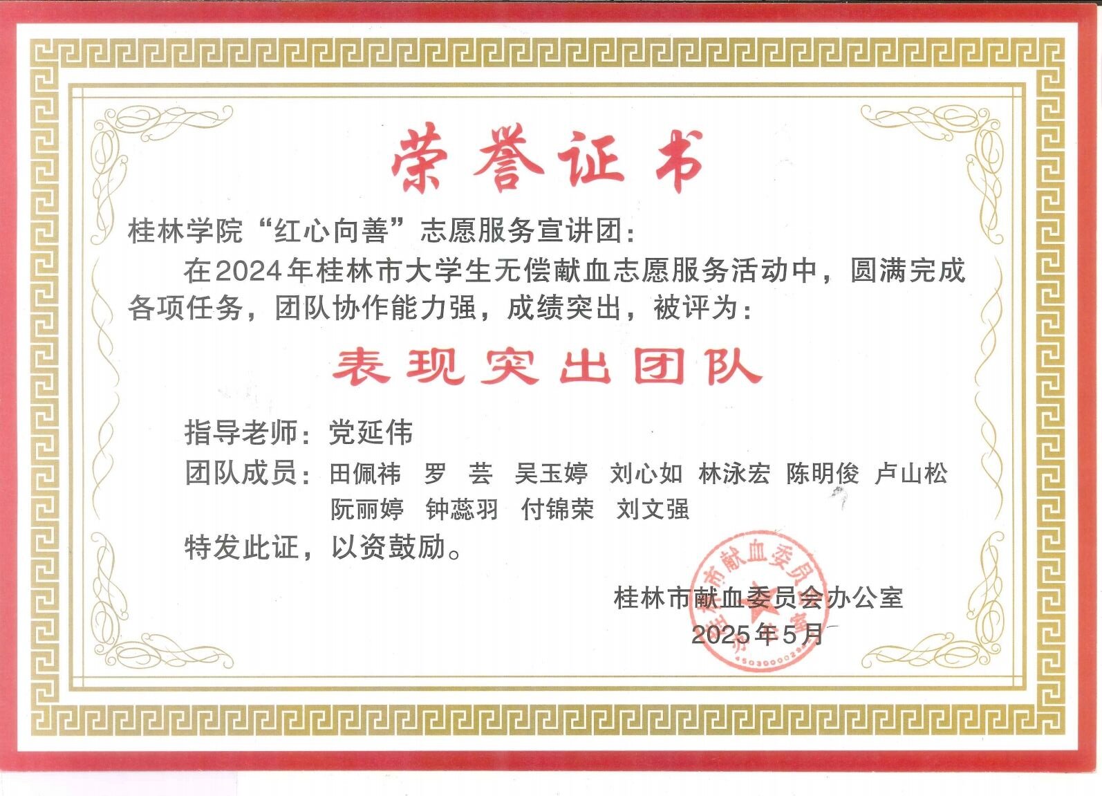 近日,桂林市献血委员会办公室对2024年桂林市大学生无偿献血志愿服务活动优秀团队进行表彰,我校“红心向善”志愿服务宣讲团圆满完成各项任务,团队协作能力强,成绩突出,荣获“表现突出团队”荣誉称号。