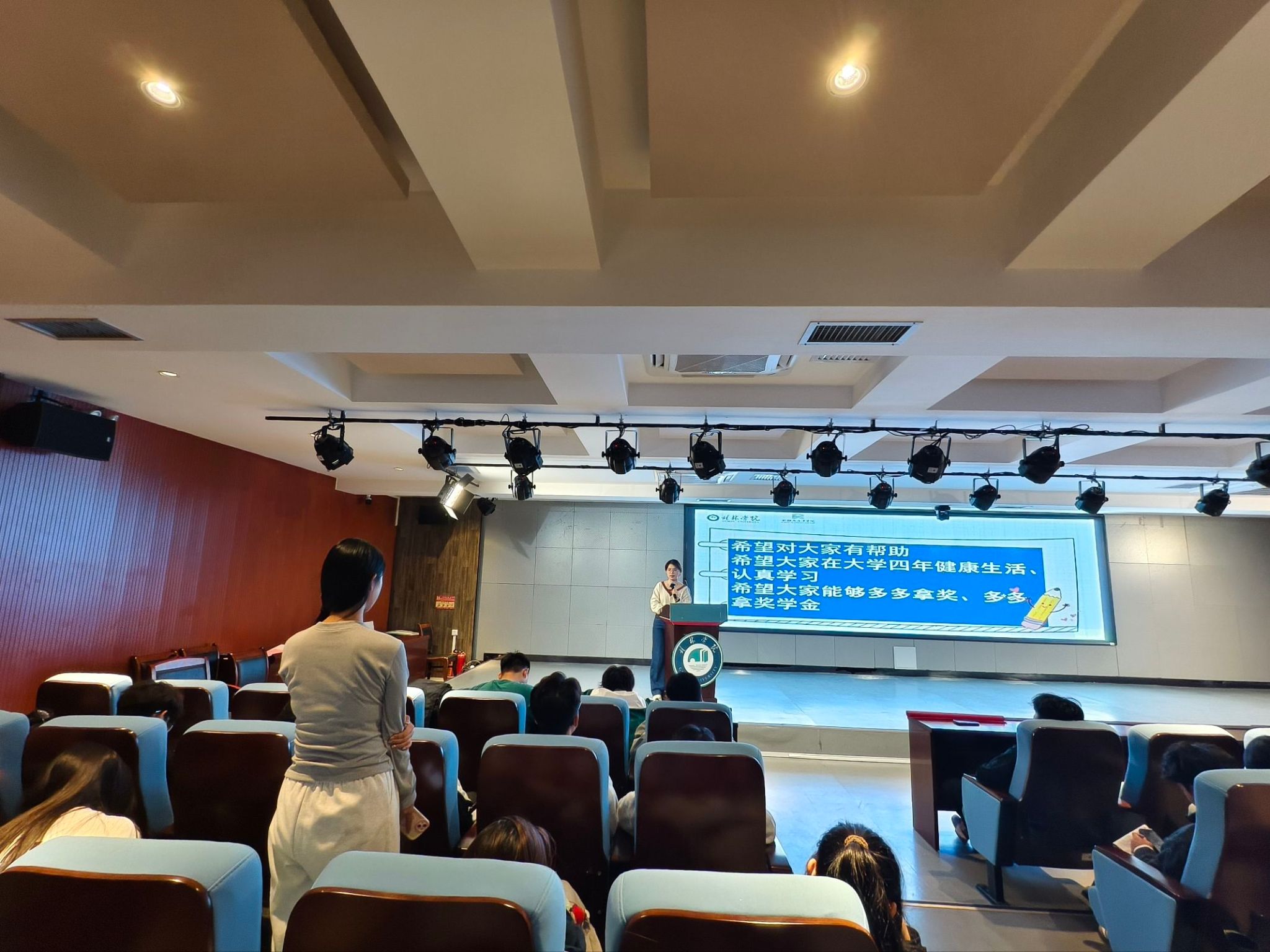 宣讲会上,庞燕秋围绕“学科竞赛+创新创业大赛”两大主题展开分享。在学科竞赛部分,她结合自身参赛经历,生动阐释了竞赛经历在毕业实习和求职就业中的积极作用,并对学校相关政策进行了系统解读,帮助新生构建全面的赛事认知。在创新创业大赛环节,她聚焦竞赛规则与备赛策略,强调参赛项目应立足现实痛点,突出创新性与实用性,并兼具切实的商业价值。同时,她指出,清晰的书面表达与出色的演讲能力亦是比赛中不可或缺的关键素养。