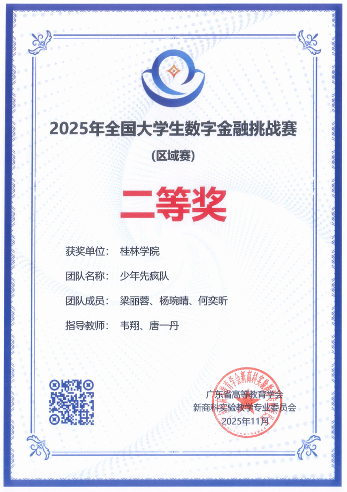 近期,2025年数字金融挑战赛(区域赛)落下帷幕,我校参赛团队以扎实的专业功底和突出的创新能力,五支战队全部获奖,共斩获二等奖1项、三等奖4项,创下我校在该项赛事中的最佳战绩。