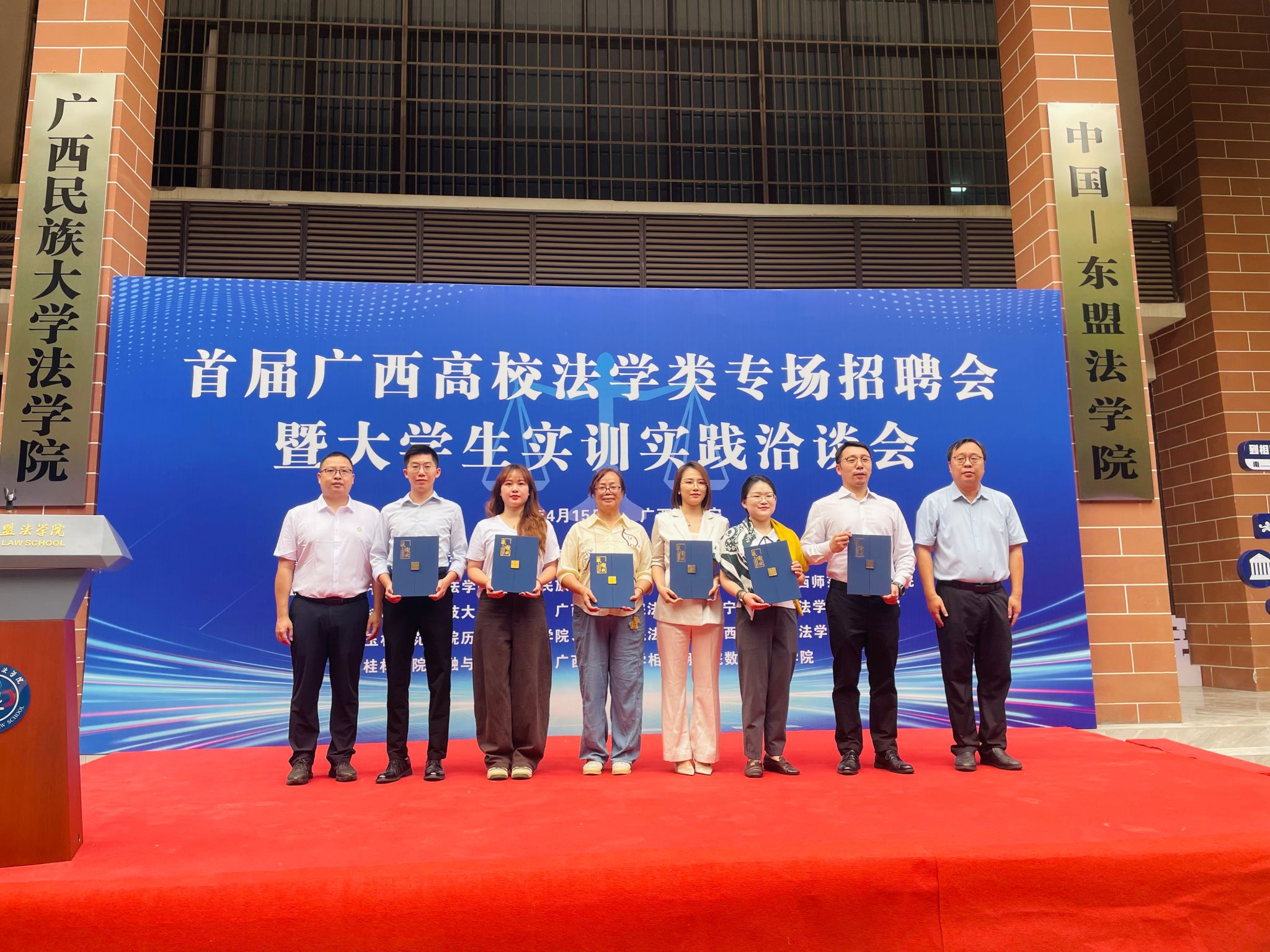 启动仪式上,中国—东盟法学院执行院长、广西民族大学法学院院长陈星致辞,指出本次招聘会搭建了“十百千”校地精准对接平台,为法学专业学生提供了优质就业与实训实践机会。我院党总支副书记作为高校代表,为参会用人单位颁发感谢状,致谢各单位对高校法学人才培养与毕业生就业工作的鼎力支持。