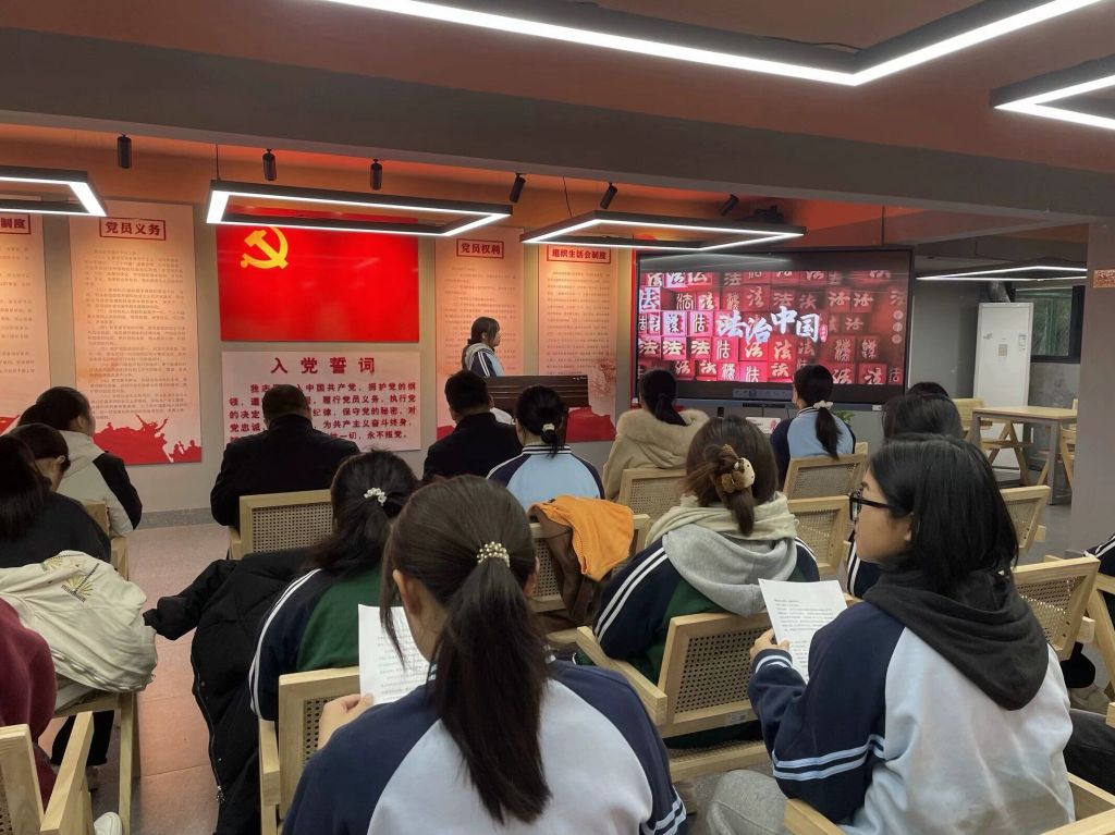 本次大会分为两个部分,首先是第一议题的学习。与会成员集体观看视频《跟着总书记看中国|法治中国》,学习习近平法治思想。视频学习结束后,林副处长紧扣第一议题内容,精心准备并讲授了一堂主题鲜明的微党课。林副处长强调,习近平法治思想作为我们党在新时代背景下推进全面依法治国的根本遵循和行动指南,不仅具有深远的理论意义,更对金融与法律学院的学生和党员而言,是一次深刻感悟法治精神、接受思想洗礼的宝贵契机。他殷切期望在场的党员及入党积极分子能够积极响应号召,努力成为习近平法治思想的忠实践行者和引领潮流的“排头兵”,自觉树立起对社会主义法治的崇高信仰,成为其忠实的崇尚者、自觉遵守者和坚定捍卫者。他鼓励大家以实际行动践行法治精神,为推动全面依法治国、实现中国式现代化贡献自己的青春智慧和力量。