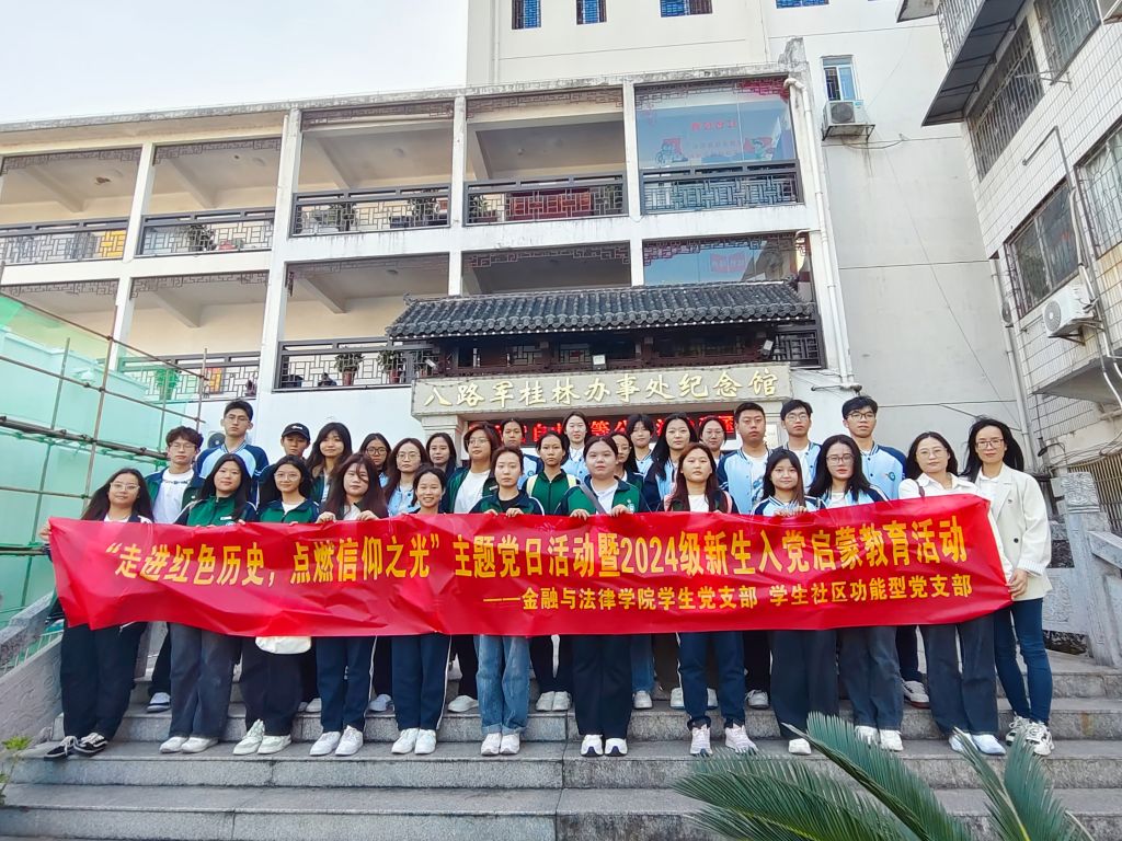 为深入贯彻党的二十大精神,进一步加强理想信念教育,提升党组织的凝聚力、号召力和战斗力,10月25日,金融与法律学院学生党支部在八路军桂林办事处纪念馆隆重举办“走进红色历史,点燃信仰之光”主题党日活动暨2024级新生入党启蒙教育活动。此次活动由学生党支部书记亲自带队,支部正式党员、预备党员、积极分子代表以及2024级已提交入党申请书的团员代表参加,共同追寻红色记忆,感悟初心使命。