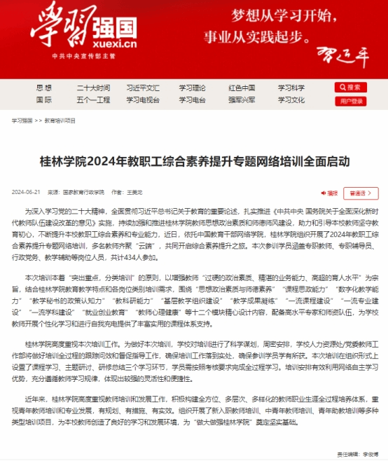 学习强国《桂林学院2024年教职工综合素养提升专题网络培训全面启动》