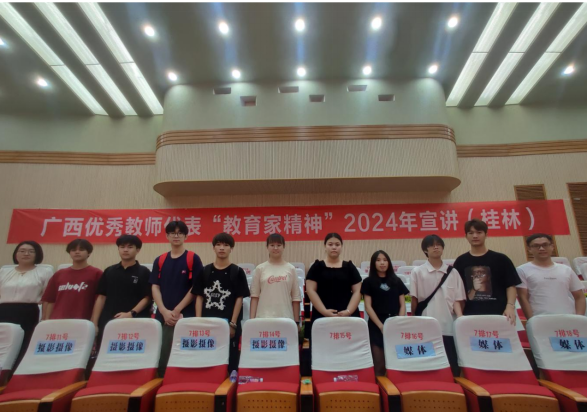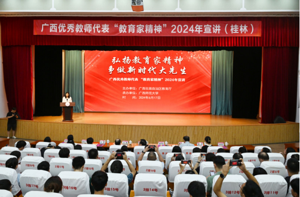 为深入学习贯彻习近平总书记关于教育的重要论述,大力弘扬教育家精神,全面提升师范生整体素质和推进高质量教师队伍建设,6月17日,我校组织了40余名师生代表前往广西师范大学参加广西优秀教师代表“教育家精神”2024年宣讲活动暨首场报告会。广西师范大学党委书记贺祖斌、自治区教育厅教师工作处曾晖处长出席活动并致辞,广西师范大学党委常委、副校长黄晓昀主持本次宣讲活动。