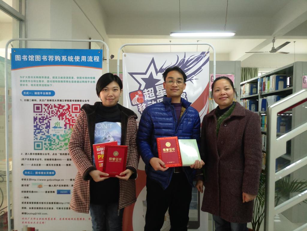 图书馆馆长何秀梅(左二)与“荐购之星”二、三等奖读者合影