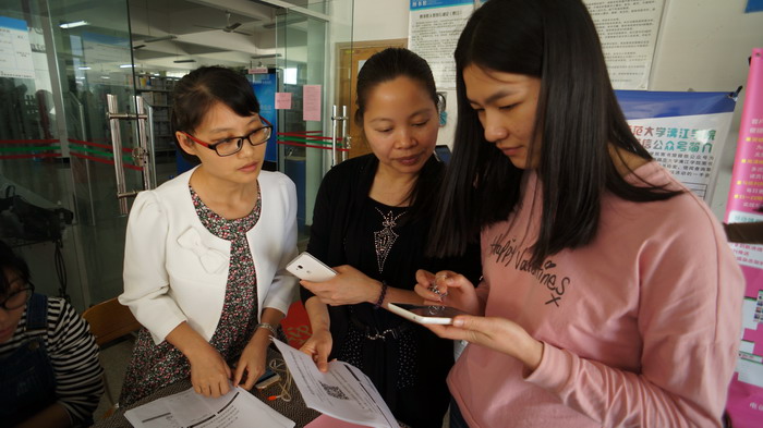 此次活动主要推广图书馆微信公众号、移动图书馆、博看人文电子期刊以及读秀等电子资源,活动得到广大同学的支持和积极参与。活动伊始,同学们迫不及待地咨询各项活动规则,在老师们的耐心指导下,同学们纷纷拿出自己的手机扫描安装电子资源客户端,并认真按照老师的指导进行各项操作,顺利完成操作的同学还获得抽奖机会,限时答题和关注过图书馆微信的读者也领取小礼品。现场同学表示今后会继续关注图书馆电子资源建设,积极开展移动阅读,利用电子资源开展专业学习和论文写作,享受数字移动阅读带来的乐趣。