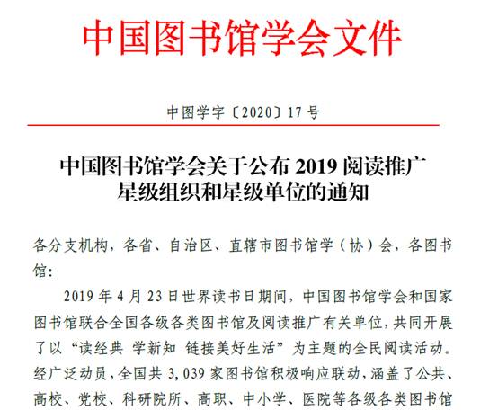 近日,中国图书馆学会发布了《中国图书馆学会关于公布2019阅读推广星级组织和星级单位的通知》(中图学字[2020]17号),广西师范大学漓江学院图书馆被中国图书馆学会授予“2019阅读推广星级单位”,这是中国图书馆学会对我校图书馆开展全民阅读推广工作的肯定。