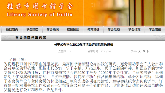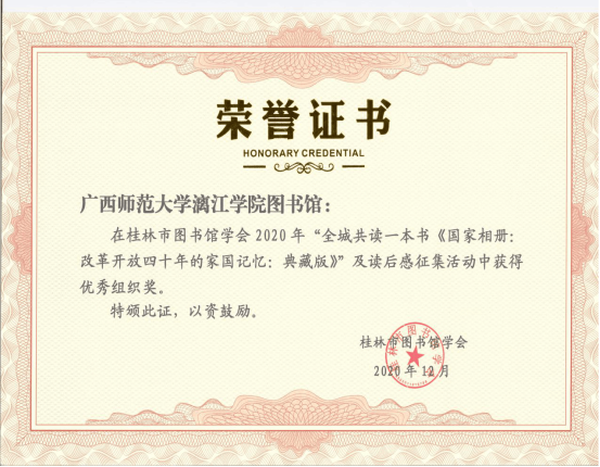 由桂林市图书馆学会组织开展的2020年“全城共读一本书——《国家相册:改革开放四十年的国家记忆:典藏版》及读后感征集活动结果近日公布,我校图书馆组织选送的语言文学学院林贤丽同学的读后感“匠心之作的魅力”,语言文学学院郭蕊同学的读后感“读《国家相册》,感时代变迁”等获本次征集活动一等奖,图书馆冯娟老师的读后感“变”获征集活动二等奖,朱晓蕊等3名同学的读后感获征集活动三等奖,于火兰等9名同学的读后感获征集活动优秀奖,我校图书馆在本次同城共读活动中获优秀组织奖。