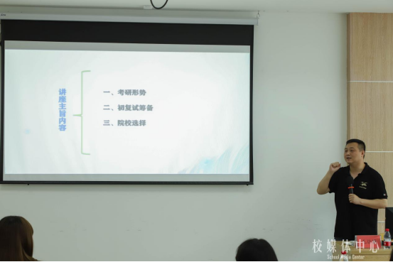 讲座上,毛访蘅教授分别从考研形势、初复试筹备、院校专业选择等三个方面对有意向考研的同学进行了指导。毛老师首先向同学们介绍了当前本科生的就业形式,结合相关数据,指出本科生考研已经成为一个大的趋势;对于考研基础常识,毛老师向同学们介绍了考生在选择考研院校和专业时应注意的事项,提出了“考研方向循兴趣,结合实际勇出发”的指导意见。讲座过程中毛老师语言风格幽默风趣、案例介绍内容丰富,前来聆听讲座的同学受益颇丰。