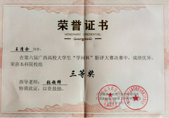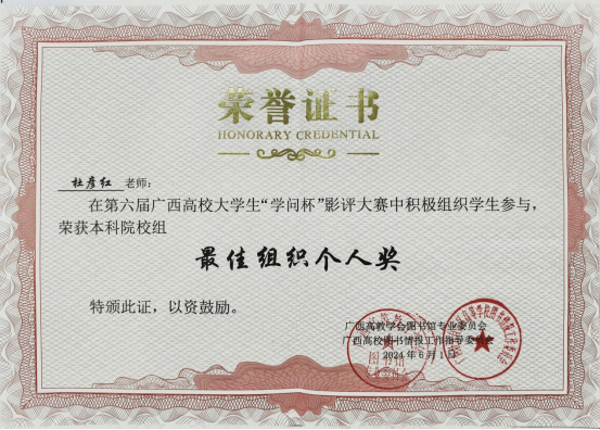 6月1日,以“礼敬中华传经典 培根铸魂育新人”为主题的第六届广西高校大学生“学问杯”影评大赛决赛在桂林旅游学院图书馆成功举行。本次大赛由广西高教学会图书馆专业委员会和广西高校图书情报工作指导委员会主办,桂林旅游学院承办,广州红霖信息科技有限公司协办。我校晋级决赛的传媒与新闻学院刘洋、人文学院王清合两位同学荣获本科院校组三等奖。我校还获得了最佳组织单位奖,杜彦红老师获得最佳组织个人奖。