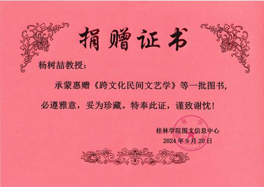 近日,广西师范大学中国语言文学学科教授、我校原校长杨树喆博士向校图书馆捐赠了一批个人珍藏图书。这是他继2020年和2022年两次捐赠个人学术著作之后的第三次捐赠,共100余册,价值万余元,内容涉及文学、教育、历史文化等领域,具有较高的收藏和利用价值。校图文信息中心负责人代表图书馆接受了赠书,同时向杨树喆颁发了捐赠证书。目前,图书馆已完成捐赠图书的分编录入、上架,欢迎广大师生借阅。