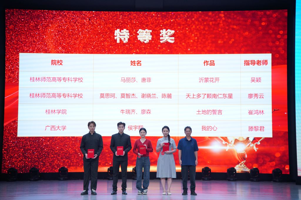 11月2日,由广西高教学会图书馆专业委员会、广西高校图书情报工作指导委员会主办的第六届广西高校大学生“书海徜徉 文脉相传”朗诵大赛决赛,在桂林医学院大学生艺术中心圆满落幕。由我校选送的2022级、2021级播音与主持艺术专业牛瑞齐、廖森二人合作的作品《土地的誓言》、2023级播音与主持专业张尚豪、欧彤彤二人合作的作品《永生的和平鸽》进入现场决赛。经过激烈角逐,我校选手脱颖而出,两组作品均获得本科院校组奖项,其中,《土地的誓言》荣获特等奖,《永生的和平鸽》荣获二等奖。传媒与新闻学院崔鸿林老师获优秀指导老师奖。