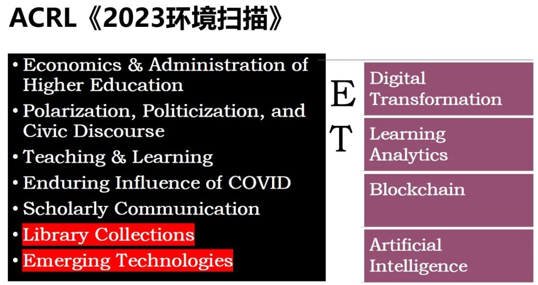 上图是北美大学图书馆组织(ACRL)做的2023年环境扫描,其中有两点我认为特别重要。一个是图书馆馆藏。如果不注重图书馆的馆藏建设,没有资源,那服务是没有前途的。再一个就是新技术。新技术有四个方面:数字转换、学习分析、区块链和人工智能。这是国际上发达国家所关注的新技术。从世界人工智能大会可以看到每年关注的点是不完全一样的,2023年、2024年应该说是大模型热,特别是AI伦理治理、大模型、数据、算力、具身智能,这些跟图书馆也越来越有关系。