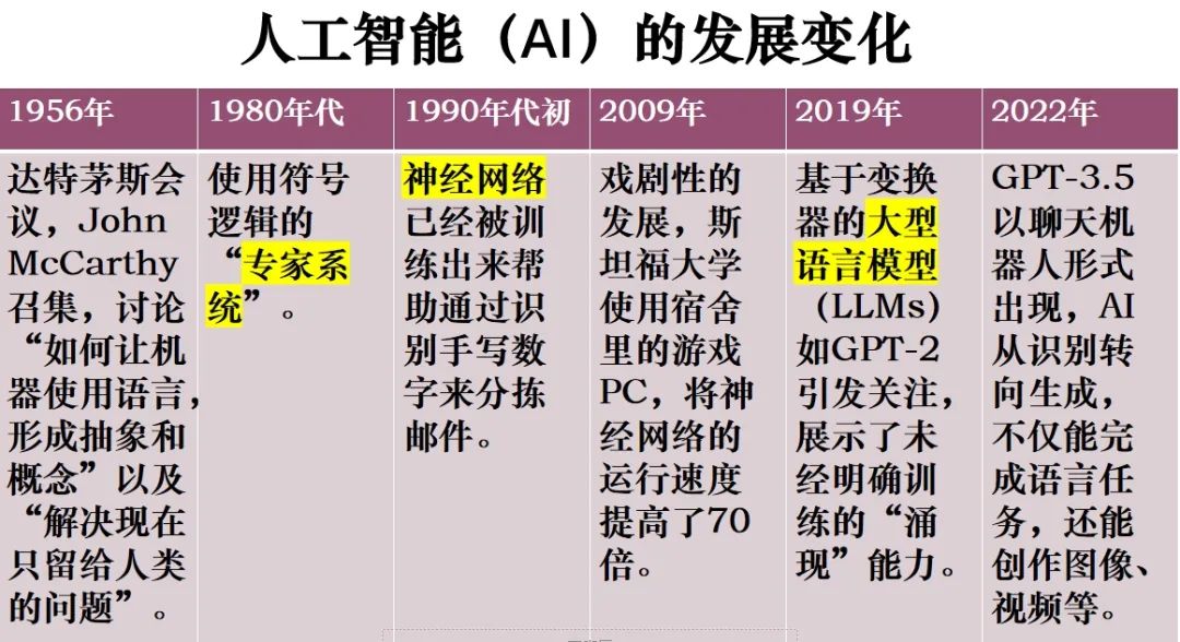 从上图可以看到人工智能的发展变化,50年代,我们就开始讲人工智能,但是到了80年代,人工智能发挥的作用并不大,因为当时的人工智能主要是专家系统,它的作用是有限的,它只对一些领域有作用。到90年代,神经网络的出现,特别是2019年大模型的出现,这两个彻底改变了人工智能。所以,今天的人工智能才是重塑社会最有价值的技术。