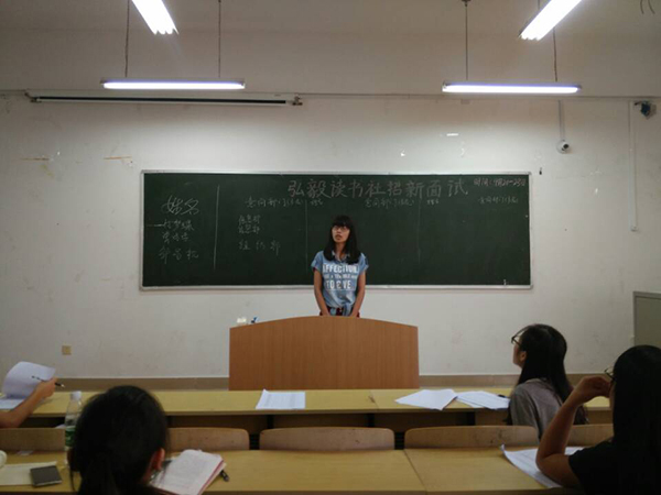 9月20日星期天下午三点,弘毅读书社在1411教室开展了新学期招新工作的初试。虽然是刮风下雨天,但是招新现场依旧气氛火爆,面试等待区座无虚席。小鲜肉们在教室门外耐心等待面试。面试官的问题多种多样,但都没能难倒这些知识面广、爱阅读的小鲜肉们,面试过程精彩纷呈,整个面试历时三个小时,下雨天仍然阻挡不了他们对于弘毅读书社的热情。