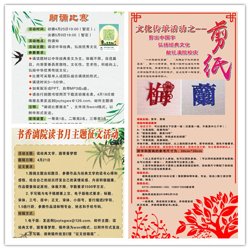 图书馆从2009年4月第一届读书月活动至今已开展了十届“书香漓院”读书月活动,对促进在校园形成良好的阅读氛围起到了一定的作用。本届读书月图书馆计划组织开展一系列与阅读相关的活动,分别是“读经典文学、圆青春梦想”主题征文、优秀电影展播、经典阅读名师讲座、传统文化书籍导读、经典美文朗诵、主题剪纸剪画和电子资源使用培训等。通过两天来的对读书月活动的宣传,同学们对本次“书香漓院”读书月系列活动有了进一步的了解和认识,提高了对对阅读行为的关注。