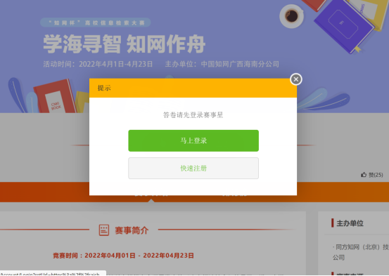 第二步:点击“我要参赛”,点击“快速注册”(若之前已经注册过账号选择登陆即可)。若弹出窗口没有注册选项,提示为“参加竞赛需要绑定手机号码”,请看下方问题解决内容。