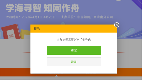问题解决:若点击“我要参赛”,弹出提示为“参加竞赛需要绑定手机号码”,说明网站自动识别登陆了学校机构账号,需要将机构账号退出。