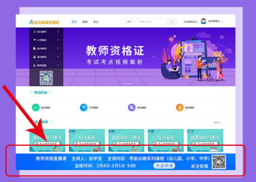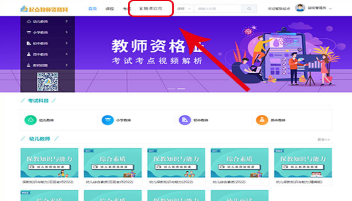 直播课回放:网页输入https://teacher.qdexam.com/进入教师资格网后点击上方红框位置