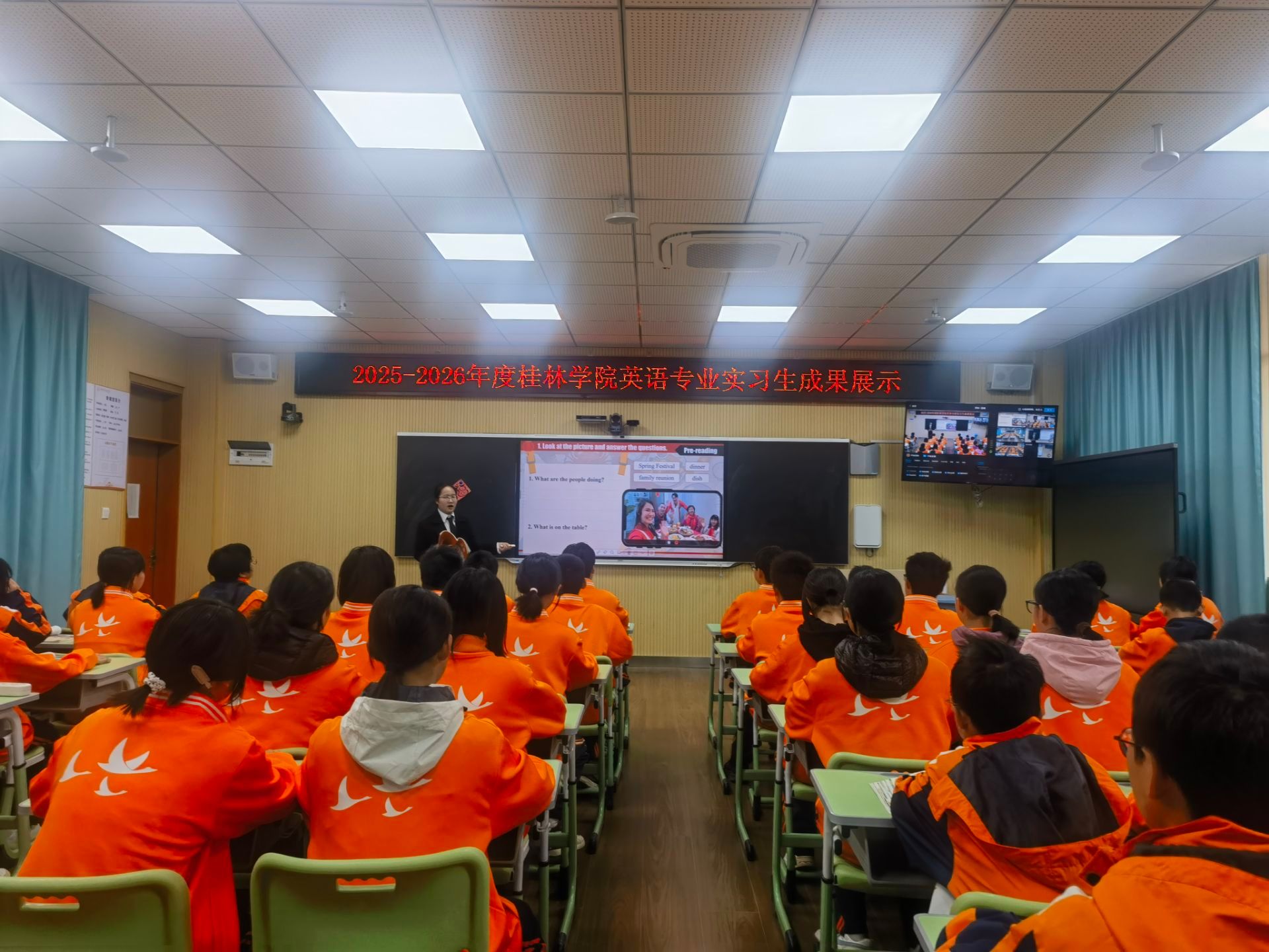 活动中,两位英语专业实习生先后登台授课。来自七年级的实习生黄玉丽以阅读教学为重点,运用丰富的视觉素材与互 动道具,将抽象知识点具象化,有效化解学习难点。课堂始终坚持以学生为中心,通过趣味提问、小组讨论等形式激发学生参与热情,学生们自信表达、积极互动,展现出良好的学习风貌,课堂衔接流畅自然,充分彰显了引导式教学的艺术魅力。