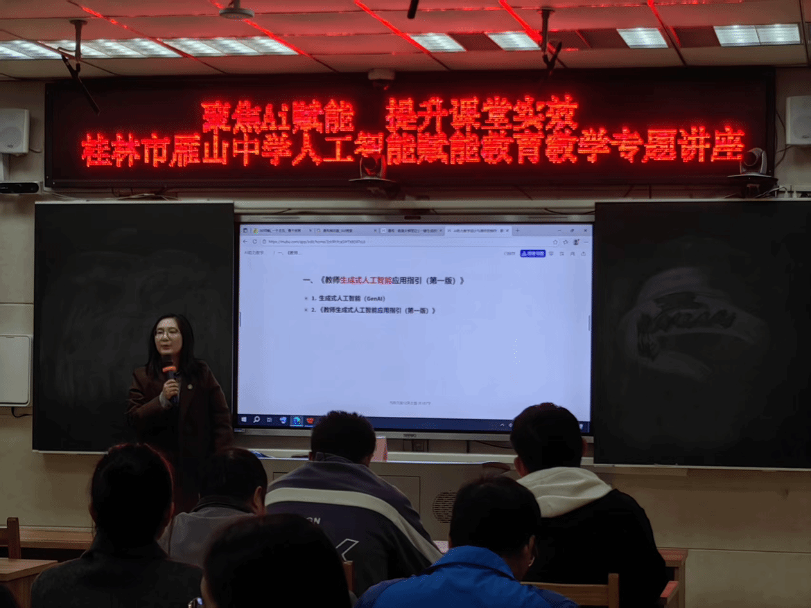 为深化人工智能与教育教学的融合创新,助力教师信息化教学能力升级,12月4日,外国语学院携手雁山中学成功举办“聚焦AI赋能 提升课堂实效”人工智能教育教学专题讲座。外国语学院汪婧副教授以“AI助力教学设计与课件制作”为主题,为雁山中学全体教师及学院实习生带来了一场兼具理论深度与实操价值的精彩分享,共同探索“AI+教学”的实践新路径。