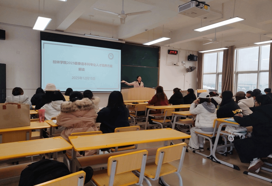 为帮助2025级新生精准把握专业定位、理清课程体系、明晰发展路径,筑牢大学学习根基,12月15日,泰语言文化教研室在至善楼2408教室成功举办2025级泰语本科专业人才培养方案解读专题讲座。本次讲座由教研室主任主讲,全体泰语专业新生到场聆听,为新生开启专业学习新征程。
