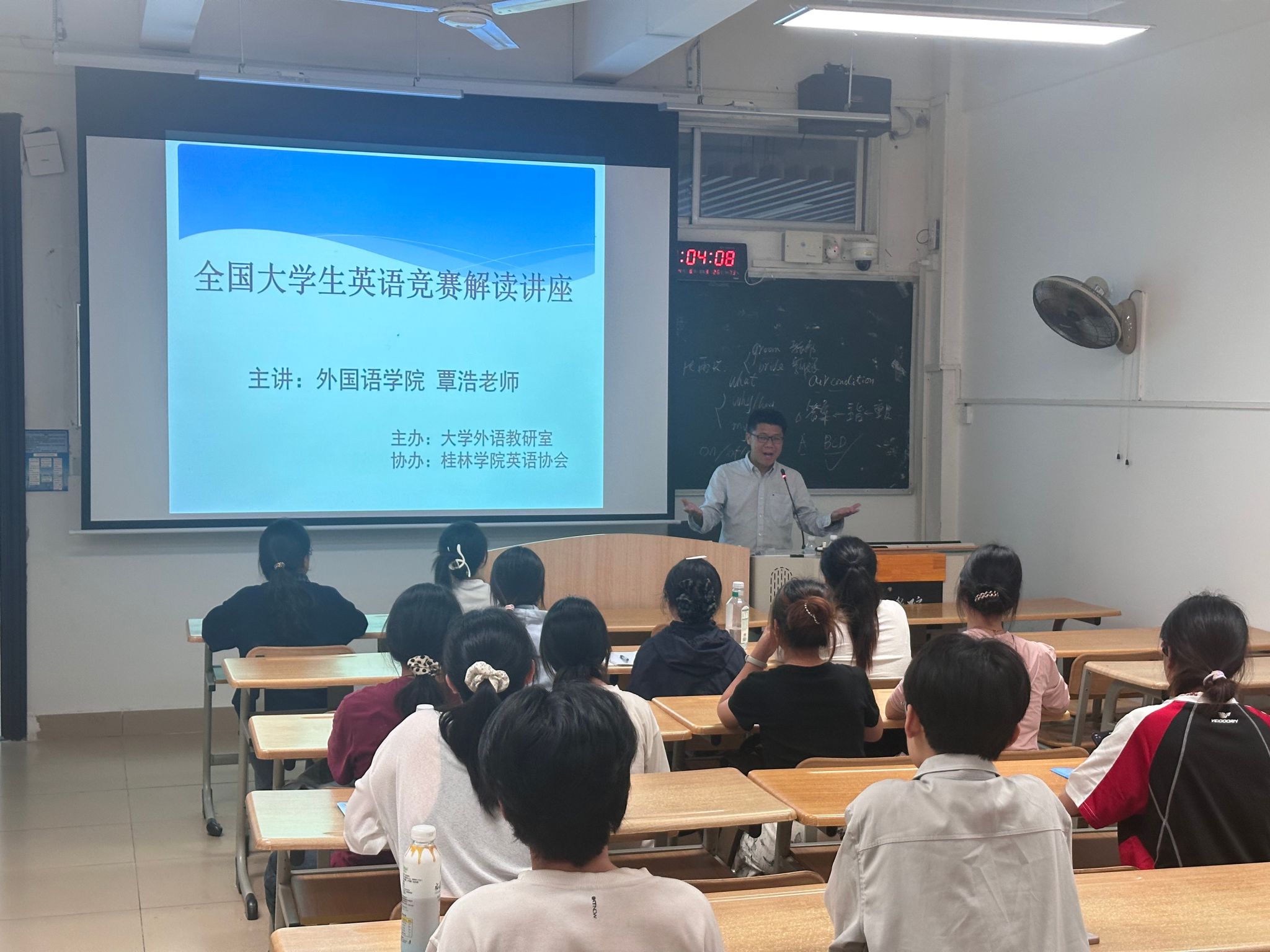 为助力学子精准把握2026年全国大学生英语竞赛(NECCS)命题趋势,高效备战赛事,4月8晚,学院在1202教室举行竞赛专题辅导讲座。本次讲座由大学外语第二教研室覃浩老师主讲,多名参赛学生到场聆听,现场学习氛围浓厚。