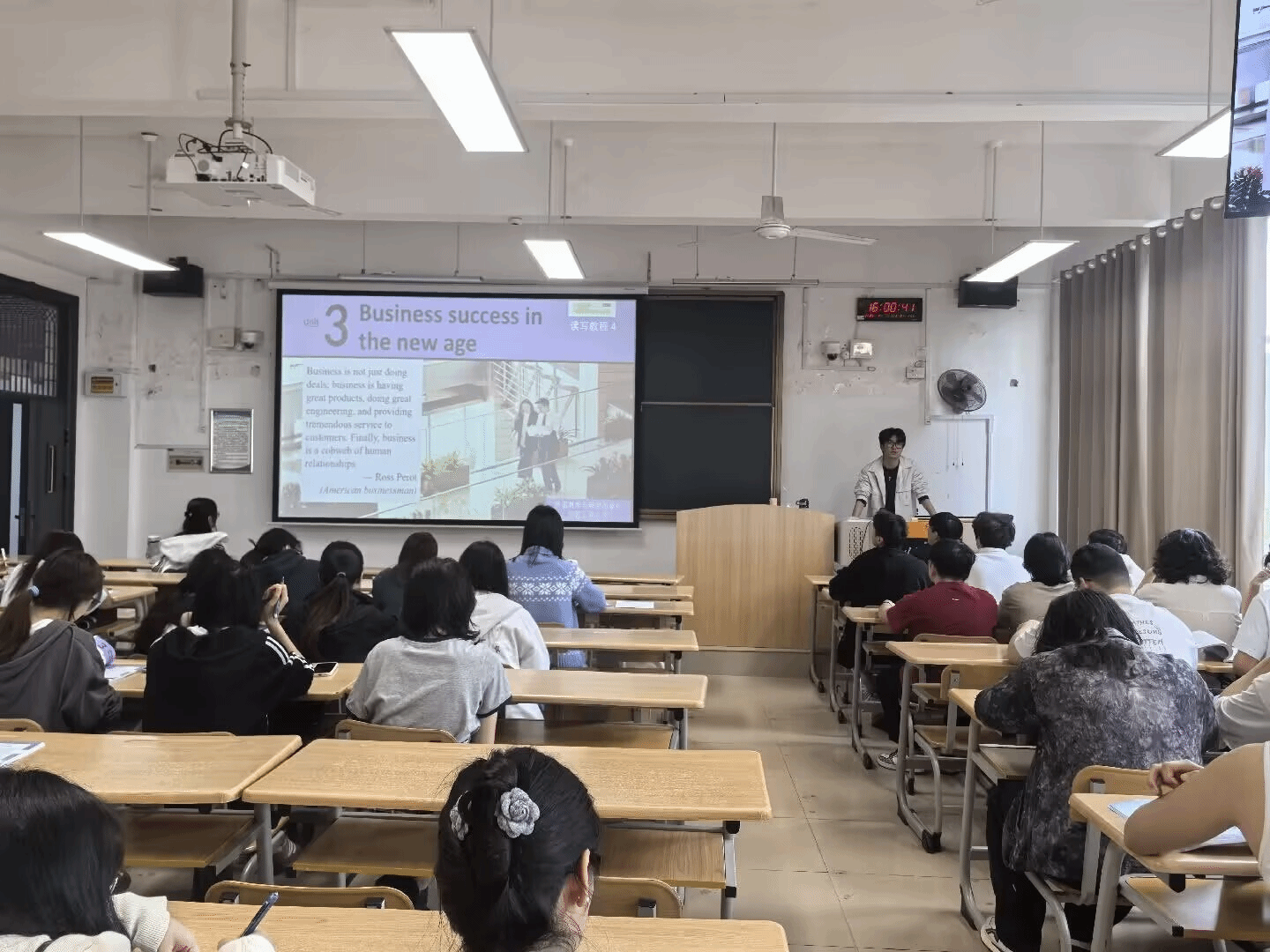课堂上,王老师围绕新时代商业发展、职场英语应用、创新思维培养、跨文化交流及OBE理念落地等核心内容展开教学,灵活运用案例分析、主题讨论等多元化教学方法,教学目标明确、流程设计完整,充分展现出严谨的教学态度与扎实的课堂教学素养。