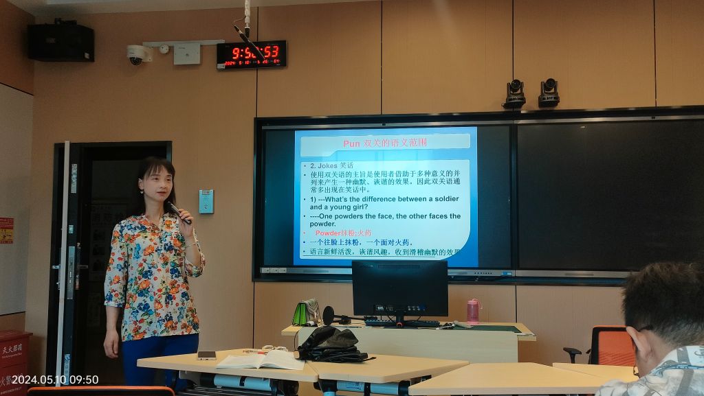 5月10日上午,人文学院英语教师教育教研室在2202教室开展公开课活动。本次公开课由欧炼芬老师主讲,向2022级英语专业学生讲授英语修辞—Pun双关,本教研室教师及其他英语专业教师参加了本次公开课。