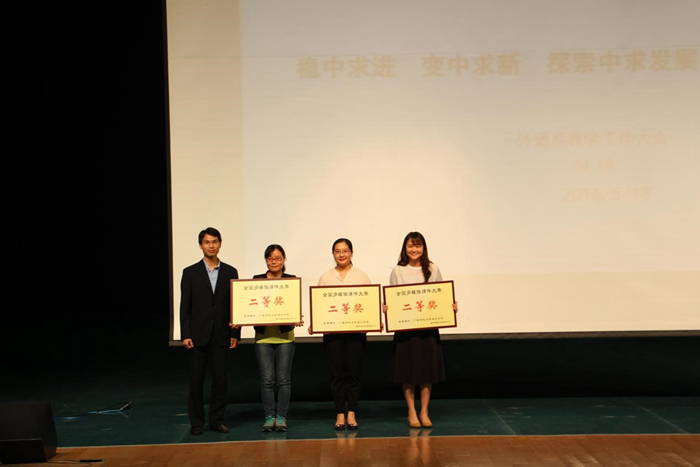 在本次教学大会上,各专业学生代表汇报了本学期期中教学检查中对各专业课程的调研结果,既有对老师们的肯定,也有对老师们授课的一些看法和建议。随后,商务英语教研室主任周燕萍介绍了商务英语专业人才培育特色,翻译教研室主任熊惠琴探讨了翻译专业的人才培育方案,有针对性地解答了学生对这2个专业人才培养的困惑。接着,进行了外语系成果表彰,表彰在2016大学生英语竞赛、2016年“外研社”杯全国英语辩论比赛等一系列竞赛中获奖的学生及2015年在全国高校多媒体课件大赛和广西高校教育教学软件应用大赛中获奖的老师们。最后,外语系主任何玲以“前进中的外语系”为题进行了慷慨激昂的演讲,对外语系下一步的发展和工作推进进行了展望。